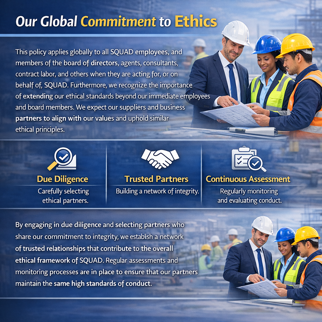 To ensure continued compliance, SQUAD implements periodic assessments and monitoring mechanisms to verify that partners and associated entities maintain the same high standards of ethical and professional behavior.