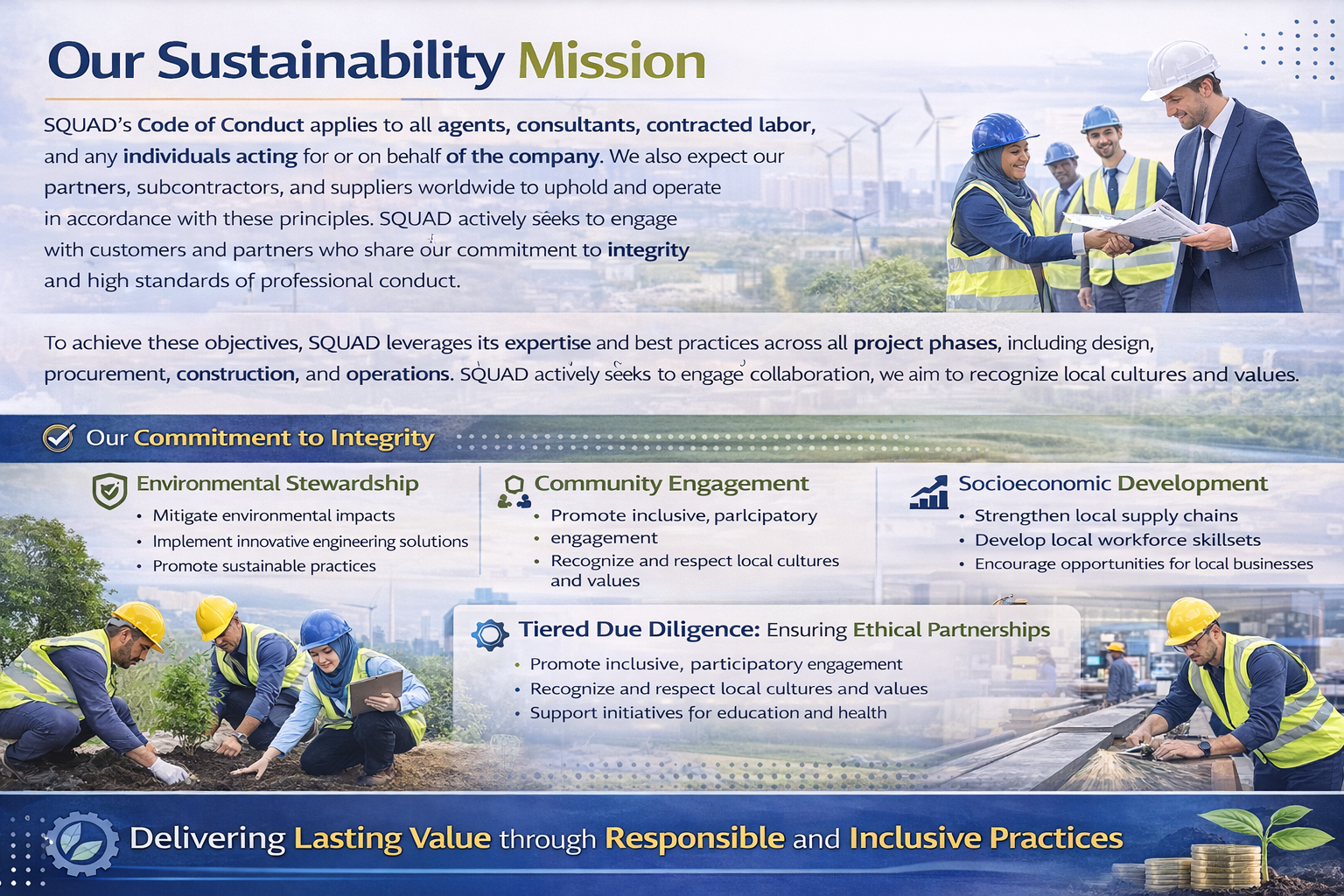 To achieve these objectives, SQUAD commits to applying its proven expertise, operational experience, and innovative engineering practices across all project phases—including design, procurement, construction, and operations. This approach ensures that projects are executed with strong consideration for environmental protection, occupational health and safety, and the well-being of individuals and communities affected by our activities.